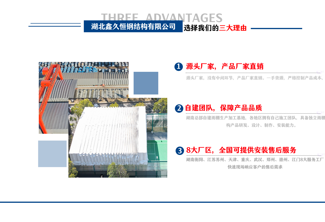 湖北鑫久恒鋼結(jié)構(gòu)有限公司是一家電動雨棚、膜結(jié)構(gòu)車棚研發(fā),生產(chǎn)銷售,施工安裝于一體的專業(yè)鋼結(jié)構(gòu)科技公司,主要產(chǎn)品有伸縮雨棚,電動雨棚,膜結(jié)構(gòu)車棚等?! 『系貐^(qū)職員目前有80多人,占地面積20000平方米,廠房面積15600平方米,配備先進(jìn)的生產(chǎn)流水線,使每件品質(zhì)產(chǎn)品的堅實基礎(chǔ)?! 」驹谔K州、天津、重慶、武漢、德州、烏魯木齊、江門均設(shè)有服務(wù)工廠,總?cè)藛T共300多人,擁有專業(yè)的技術(shù)團(tuán)隊,配備先進(jìn)的設(shè)備和流水線生產(chǎn),產(chǎn)能高,貨源充足,發(fā)貨速度快,服務(wù)區(qū)域廣。 移動伸縮棚適用于通道臨時倉儲、戶外運動遮陽、污水池遮蓋、能源交通、熱力化工、礦山、船舶制造及市政建設(shè)、物流、碼頭等領(lǐng)域的構(gòu)件制作加工,成品半成品存放、倉庫、野外儀器設(shè)備操作用房等。尤其是對工廠發(fā)貨、倉儲臨時遮雨防嗮,梅雨期較長、建設(shè)周期較短的工程施工等特別適用。還可根據(jù)用戶需求量身定制、適合企業(yè)所需不同款式的產(chǎn)品?! ∥夜緢猿帧罢\信社會為本,客戶滿意為榮”的經(jīng)營理念,做到質(zhì)量把控,嚴(yán)格管理,精益求精,恪守承諾。使鑫久恒逐步走向成熟,其系統(tǒng)化、專業(yè)化日趨完善。以專業(yè)的技術(shù)、科學(xué)的管理,更高的產(chǎn)品質(zhì)量,優(yōu)良的企業(yè)信譽,真誠的客戶服務(wù),靈活多樣的經(jīng)營方式和務(wù)實創(chuàng)新的企業(yè)精神愿與社會各界攜手合作,為推動智能鋼結(jié)構(gòu)建筑事業(yè)的發(fā)展而不斷努力。...